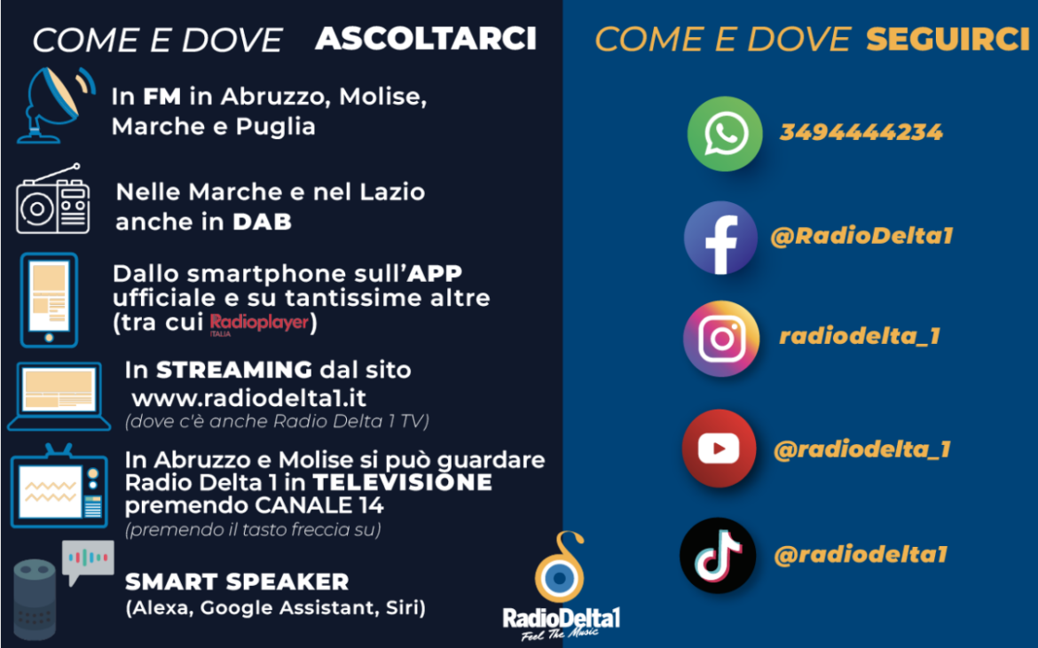 Nella regione Lazio, Radio Delta1 da oggi puoi ascoltarla anche in DAB (diffusione audio digitale). In Italia ci sono oltre 11 milioni di persone che ascoltano la radio solo in digital radio. Il Digital Audio Broadcasting permette di ascoltare la radio con una qualità audio altissima. Se sei in viaggio, in alternativa all'Fm, sulla tua autoradio puoi selezionare il Dab e scegliere Radio Delta1. Delta1 la ascolti in DAB anche […]